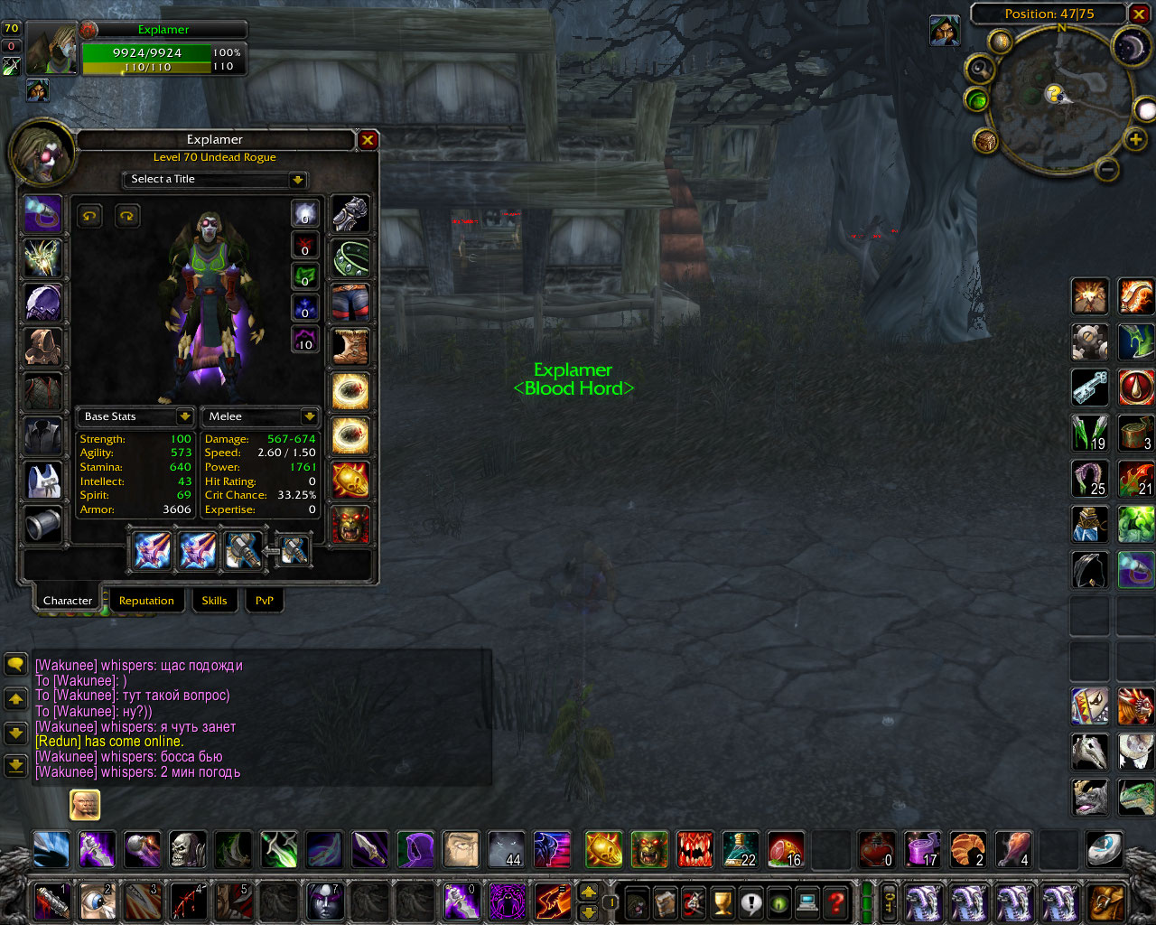 | • Ник персонажа-Explamer • Раса/Класс/Уровень персонажа: undead/rogue/70 • Ваше имя: Тимофей • Место жительства (страна, город): Украина,Миргород • Ваш возраст: 15лет • Ваш род занятий и график: играю почти каждый день с 16:00 по выходных страйкбол • Являетесь ли вы уникальным владельцем персонажа с момента его создания:да качял с 1лвл • Опыт игры на сервере WNet: играю 3года • Опыт игры на других серверах: 4.0.6. пару месяцев • Как давно играете данным персонажем: 3года • Предпочтительный билд: 15/0/46 • Есть ли опыт игры в других билдах: ранше играл во второй ветке но уже забыл)) • Перечислите всех персонажей, которыми вы играли / играете на сервере WNet : альянс паладин ник Askal • Количество времени, которое вы уделяете игре: 3-4часа может больше • Гильдии, в которых вы состоите/состояли ранее и причины ухода : Blood Hord так как онлайн упал половина гильдии просто кинула серв и онлайн 2-3человека скучновато так играть в Blood Hord состоял с 2009года • Почему вы хотите к нам вступить? Чего вы ожидаете от гильдии?: общения, нормальную компанию чтоб походить по инстам и просто поиграть в нормальном колективе • Есть ли у вас в нашей гильдии друзья, которые смогут за вас поручиться: Ваши профессии и скилл : Инженирия-375 мининг-375 • Готовы ли вы менять билд под нужды рейда и по просьбе РЛ? : да • Конфигурация вашего компьютера : частота проца 3.00Ггц видюха 1гб GF9500 GT,две планки DDR3 по 2гб • Бывают ли у вас дисконекты, как часто. Средний пинг в игре. Скорость канала интернета: дисконекты неочень чясто средний пинг 91-123,скорость интернета от 1мб до 9мб • Скриншот главного окна персонажа (клавиша "С"): Добавлено (20.04.2011, 21:49) --------------------------------------------- Wakunee за мну поручиться я знаю:)