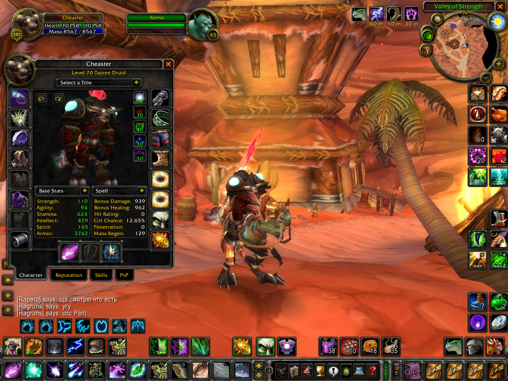 | • Ник персонажа (если был переименован, то и старый и новый ник): Cheaster • Раса/Класс/Уровень персонажа: Tauren Druid 70 lvl • Ваше имя: Евгений • Место жительства (страна, город): Россия г.Воскресенск МО • Ваш возраст: 16 лет • Ваш род занятий и график: Школьник • Являетесь ли вы уникальным владельцем персонажа с момента его создания (то есть вы качали его с 1 уровня): Являюсь • Опыт игры на сервере WNet: 1 год • Опыт игры на других серверах: WOtLK Circle x50 3 месяца • Как давно играете данным персонажем: 1 год • Предпочтительный билд: 47/11/3 • Есть ли опыт игры в других билдах: рестор • Перечислите всех персонажей, которыми вы играли / играете на сервере WNet (ник, фракция, класс, уровень): Fearzs 49 Undead Rouge, Wazlemir 61 Undead Warlock, Horizon 29 Undead Warrior, Swog 28 Troll Mage( это мои персы) Azzok 70 Orc Warrior(имею доступ к этому персонажу) • Количество времени, которое вы уделяете игре: 2-3 часа в будни, 3-5ч в выходные • Гильдии, в которых вы состоите/состояли ранее и причины ухода (обязательно подробно): Proxima был маленький онлайн, Blood Hord распалась потому что половина ги кинула серв • Почему вы хотите к нам вступить? Чего вы ожидаете от гильдии?: хочу вступить потому что хороший дружный коллектив, ожидаю от гильдии общения,походы в инсты,новых друзей • Есть ли у вас в нашей гильдии друзья, которые смогут за вас поручиться: Setram,Wakunee,Cassy • Ваши профессии и скилл (только основные): Engineering(360), Mining(372) • Готовы ли вы менять билд под нужды рейда и по просьбе РЛ? Да,конечно • Конфигурация вашего компьютера (ответы "хорошая" или "пойдет" нас не устраивают): Intel® Core i5 CPU 650, ОЗУ 6Гб, Видеокарта ATI Radeon HD 5850 • Бывают ли у вас дисконекты, как часто. Средний пинг в игре. Скорость канала интернета: Дисконекты бывают очень редко. Средний пинг в игре от 50-80. Скорость канала интернета 100Mb • Скриншот главного окна персонажа (клавиша "С"):