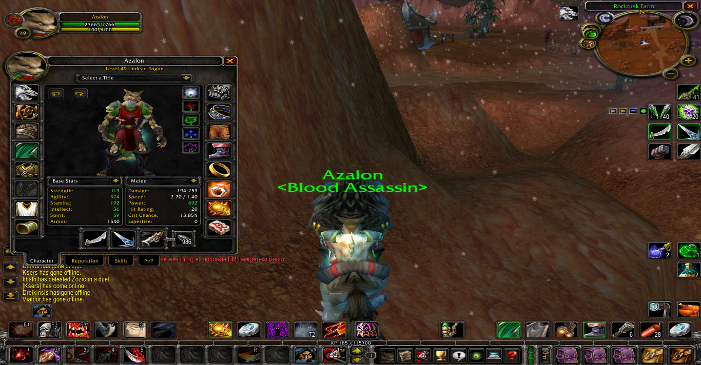 | • Ник персонажа (если был переименован, то и старый и новый ник): Azalon • Раса/Класс/Уровень персонажа: Undead/Rogue/49 lvl • Ваше имя: Славик • Место жительства (страна, город): Украина.Бережаны • Ваш возраст: 13 лет • Ваш род занятий и график: пока учюсь в школе • Являетесь ли вы уникальным владельцем персонажа с момента его создания (то есть вы качали его с 1 уровня): да • Опыт игры на сервере WNet: 1-2 года • Опыт игры на других серверах: 1 год • Как давно играете данным персонажем: точно сказать немогу но думаю 1 год • Предпочтительный билд:Subtlety • Есть ли опыт игры в других билдах: Assassination есть • Перечислите всех персонажей, которыми вы играли / играете на сервере WNet (ник, фракция, класс, уровень): Yurdinette 29 маг орда, Tamao 36 шаман орда, Emita 29 хантер орда • Количество времени, которое вы уделяете игре: каждый день играю =) • Гильдии, в которых вы состоите/состояли ранее и причины ухода (обязательно подробно): <Blood Assassin> самовольный уход. Малый онлайн в ги берут всех рогов кого попало ГМ незаходит играет гдето на другом сервере.... короч одним словом ги брошеная • Почему вы хотите к нам вступить? Чего вы ожидаете от гильдии?: Видил много 29 и 49 в вашей ги.Хочю стать одним из них =) Ожыдаю помощи от других. • Есть ли у вас в нашей гильдии друзья, которые смогут за вас поручиться: нету • Ваши профессии и скилл (только основные):Engineering 225 • Готовы ли вы менять билд под нужды рейда и по просьбе РЛ?:Готов но до рейдов мне ешё далеко =) • Конфигурация вашего компьютера (ответы "хорошая" или "пойдет" нас не устраивают): Pentium,видео карта 512 MB,ОЗУ 1 ГБ, Windows XP. • Бывают ли у вас дисконекты, как часто. Средний пинг в игре. Скорость канала интернета: если сам серв лагает то есть дисконекты а так нету,средний пинг 14-130 • Дополнительные сведения, которые вы хотите нам сообщить: • Скриншот главного окна персонажа (клавиша "С"):Добавлено (28.06.2011, 01:18) --------------------------------------------- надеюсь тут все правильно