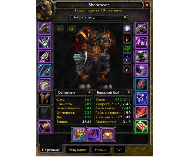 | • Ник персонажа (если был переименован, то и старый и новый ник): Shampoor • Раса/Класс/Уровень персонажа: Таурен/шаман/энх • Ваше имя: Евгений • Место жительства (страна, город): Иркутск • Ваш возраст: 17 • Ваш род занятий и график: Учеба 8-14(Ирк время +5 по МСК,) Иногда Курсы... • Являетесь ли вы уникальным владельцем персонажа с момента его создания (то есть вы качали его с 1 уровня): да • Опыт игры на сервере wowz: геры кара ЗА • Опыт игры на других серверах: На х100 • Как давно играете данным персонажем: полгода • Предпочтительный билд: Энх • Есть ли опыт игры в других билдах: Тока энх • Перечислите всех персонажей, которыми вы играли / играете на сервере wowz (ник, фракция, класс, уровень): Shampoor(70) Windrul(19) • Играли ли вы на сервере Wnet? Если да, то укажите ники персонажей и гильдии в которых были: Нет • Количество времени, которое вы уделяете игре: 3-6часов • Гильдии, в которых вы состоите/состояли ранее и причины ухода (обязательно подробно): WaRcraft-Ушел из-за отсутствия деятельности внутри ги • Почему вы хотите к нам вступить? Чего вы ожидаете от гильдии?: рейдов, интересных обсуждений и времяпрепровождения • Есть ли у вас в нашей гильдии друзья, которые смогут за вас поручиться: нет • Ваши профессии и скилл (только основные): Юва(365) Кожевничество(366) • Готовы ли вы менять билд под нужды рейда и по просьбе РЛ? Пока шмота нет на др спек) • Конфигурация вашего компьютера (ответы "хорошая" или "пойдет" нас не устраивают): 2 ядра 2Ггц 2Гб оперативы • Бывают ли у вас дисконекты, как часто. Средний пинг в игре. Скорость канала интернета: бывают редко , пинг 160, 2 мбит • Скриншот главного окна персонажа (клавиша "С"):