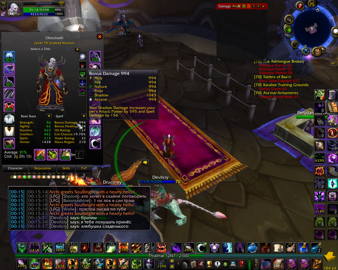 | • Ник персонажа (если был переименован, то и старый и новый ник): Obezbash • Раса/Класс/Уровень персонажа: Андед/Варлок/70 • Ваше имя: Сергей • Место жительства (страна, город): Украина, Донецк • Ваш возраст: 17 • Ваш род занятий и график: свободный график)) • Являетесь ли вы уникальным владельцем персонажа с момента его создания (то есть вы качали его с 1 уровня): Конечно • Опыт игры на сервере wowz: 4-5 месяца • Опыт игры на других серверах: 5 лет • Как давно играете данным персонажем: 2 года • Предпочтительный билд: ПВЕ дестро • Есть ли опыт игры в других билдах: Афлик (пве) • Перечислите всех персонажей, которыми вы играли / играете на сервере wowz (ник, фракция, класс, уровень): Obezbash/Орда/Андед/Варлок/70 • Играли ли вы на сервере Wnet? Если да, то укажите ники персонажей и гильдии в которых были: нет • Количество времени, которое вы уделяете игре: 5-8 часов • Гильдии, в которых вы состоите/состояли ранее и причины ухода (обязательно подробно): Была своя гильдия Punisher Of Azheroth, набирал, когда еще сам был 20-30 лвл, насобирал довольно большое колличество людей(130-169(придел)),но потом по своим семейным обстоятельствам, на некоторое время забил на игру,а заместители не справились и ГИ распалась. • Почему вы хотите к нам вступить? Чего вы ожидаете от гильдии?: ПВЕ, рейды, общение, новые знакомые • Есть ли у вас в нашей гильдии друзья, которые смогут за вас поручиться: незнаю, нет наверное • Ваши профессии и скилл (только основные): Тейлор 375, Инч 369 • Готовы ли вы менять билд под нужды рейда и по просьбе РЛ? Да • Конфигурация вашего компьютера (ответы "хорошая" или "пойдет" нас не устраивают): 2GB ОЗУ, 2.6 ГГц проц, 1 гиг видюха(думаю больше ничего и не нужно) • Бывают ли у вас дисконекты, как часто. Средний пинг в игре. Скорость канала интернета: Дисконекты,только когда серв падает. Пинг 20-60. 50мб\сек • Скриншот главного окна персонажа (клавиша "С"): Прикреплено • Дополнительные сведения, которые вы хотите нам сообщить: Знаю все тактики на боссов(все данжы),кроме в СВП на муру и келя. Отлично играю также ПРИСТ(ШП\ХОЛИ),ВАР(ПРОТ,ФУРИК),ДРУ(ФЕРАЛ) <-- пве. Ну и от себя..чем смогу, тем помогу согильдцам))